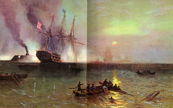 As survivors from the sinking Cumberland are being rescued, the Virginia's second challenger, the Congress, can be seen firing at her in the background. The Virginia had bypassed the Congress to attack the smaller ship first. Then the ironclad returned to pit her armor against the more numerous guns of the proud frigate. (Collection of Alexander McCook Craighead) |